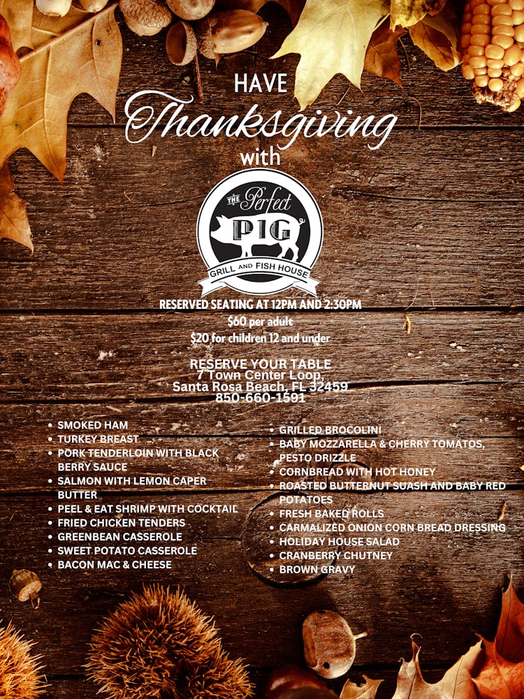 Join us this year for a Thanksgiving feast! Our Gulf Place and Watercolor locations will be open Thanksgiving Day for 2 reserved seatings and our Seagrove location will be open for breakfast on Thanksgiving Day as well as doing our Everything But The Turkey preorders, the menu for that is on their page under menus. We hope to see you there!